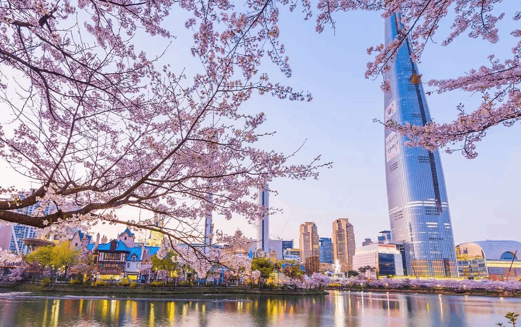 • Lotte World – công viên giải trí chủ đề trong nhà lớn và hiện đại bậc nhất Hàn Quốc. Vào mùa hoa cả khu vực được bao phủ bởi những hàng anh đào nở rộ tạo nên khung cảnh mộng mơ tựa như tranh vẽ.